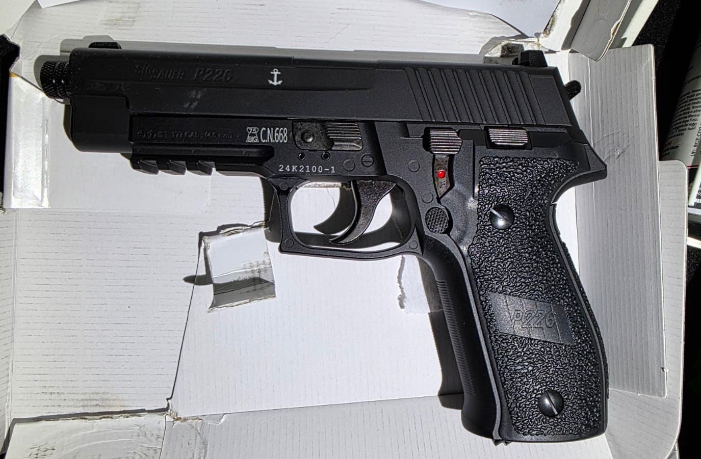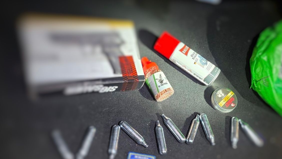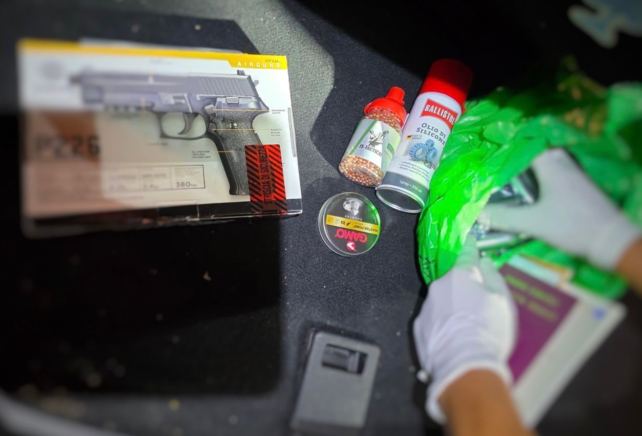 Sub roata de rezervă a mijlocului de transport au fost depistate un pistol pneumatic cu calibrul 4,5 mm, 1 479 bile marca de același calibru, 454 capse din plumb, calibrul 4,5 mm, un încărcător gol și un spray de 200 ml. Toate aceste bunuri erau nedeclarate autorității vamale.