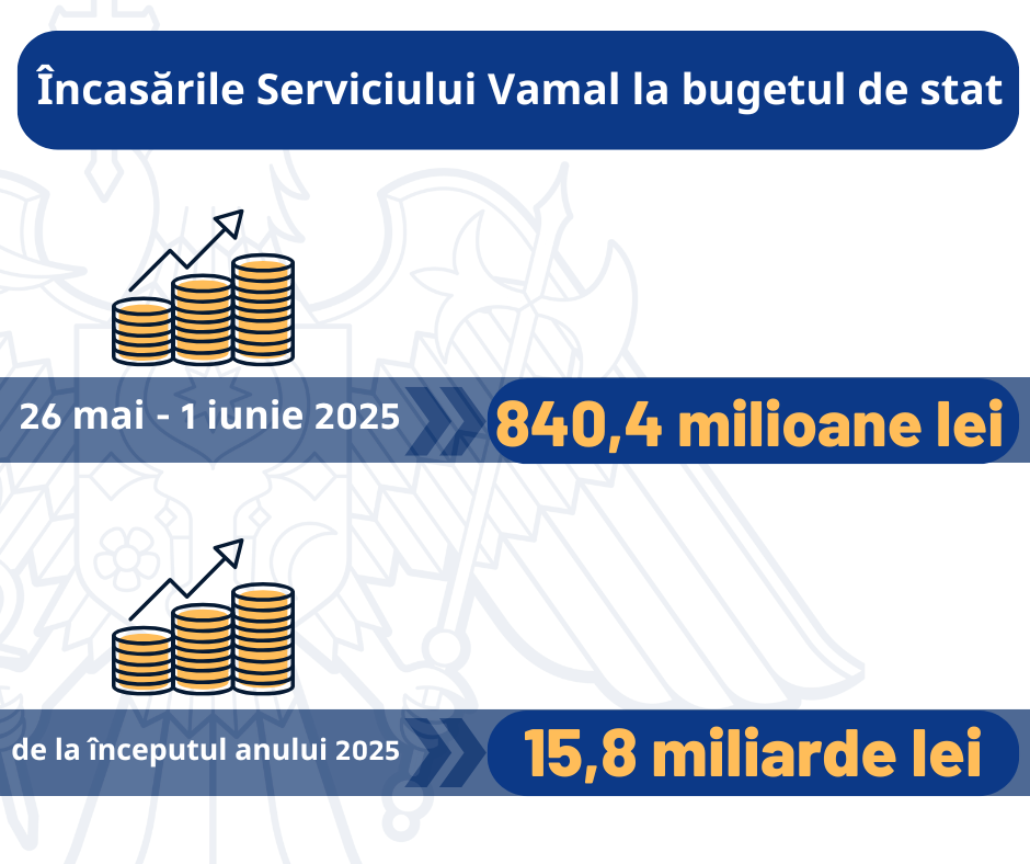 În perioada 26 mai - 1 iunie 2025, încasările Serviciului Vamal la bugetul de stat se ridică la peste 840,4 milioane de lei, ceea ce constituie îndeplinirea cifrei de control pentru perioada de referință în mărime de 104,7%, iar în luna mai 2025, Serviciul Vamal a colectat la bugetul de stat circa 3,5 miliarde lei, ceea ce constituie îndeplinirea cifrei de control la 107,6%.